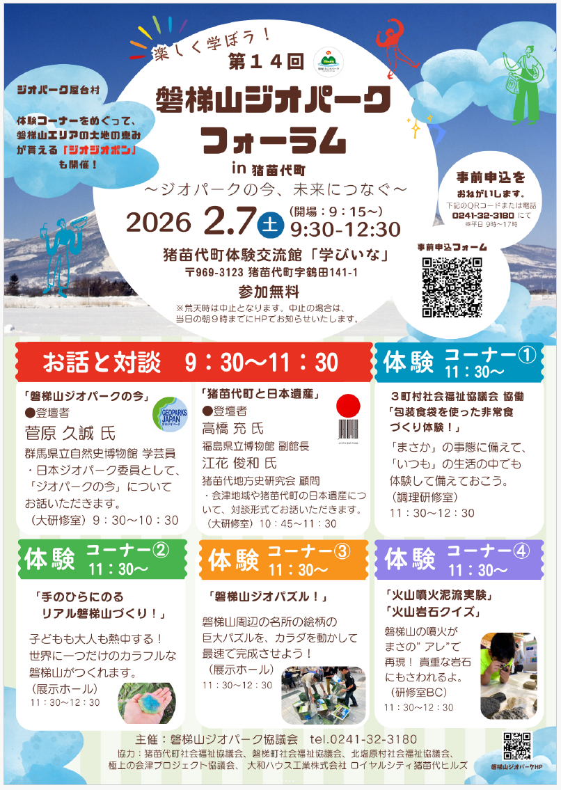 他にも「手のひらにのるリアル磐梯山づくり!」や「磐梯山ジオパズル」「火山噴火泥流実験」といった楽しい体験コーナーも開かれます。
